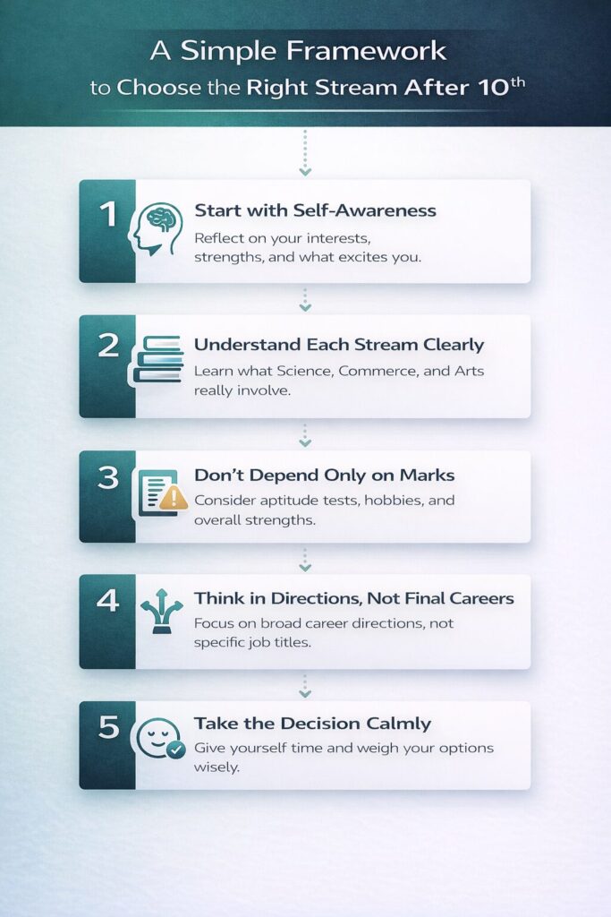 To decide the right stream after 10th, students should evaluate their strengths, interests, and learning style first. Instead of relying only on marks, compare personal fit with what each stream demands before making a decision.