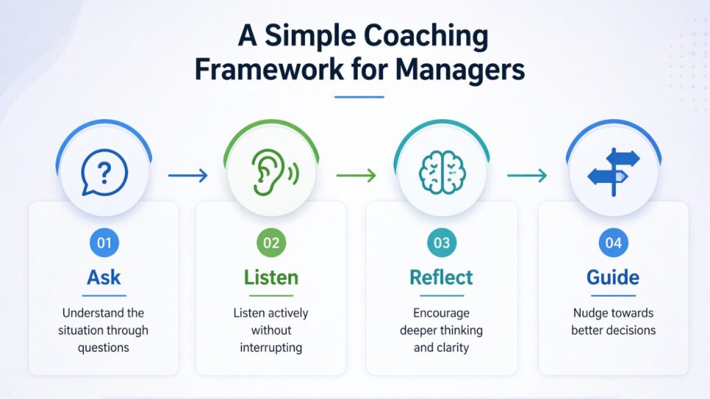 Coaching doesn’t require complex frameworks. It starts with small behavioural shifts. Instead of jumping in with answers, effective managers slow down and ask better questions. They listen more than they speak. They guide conversations rather than control them.