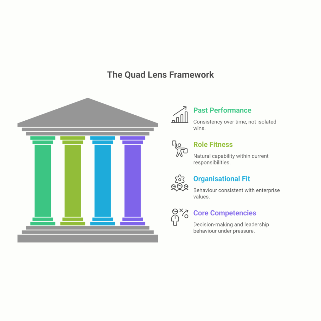 Anyone being considered for larger responsibilities deserves a holistic evaluation. A simple but powerful structure includes four dimensions: