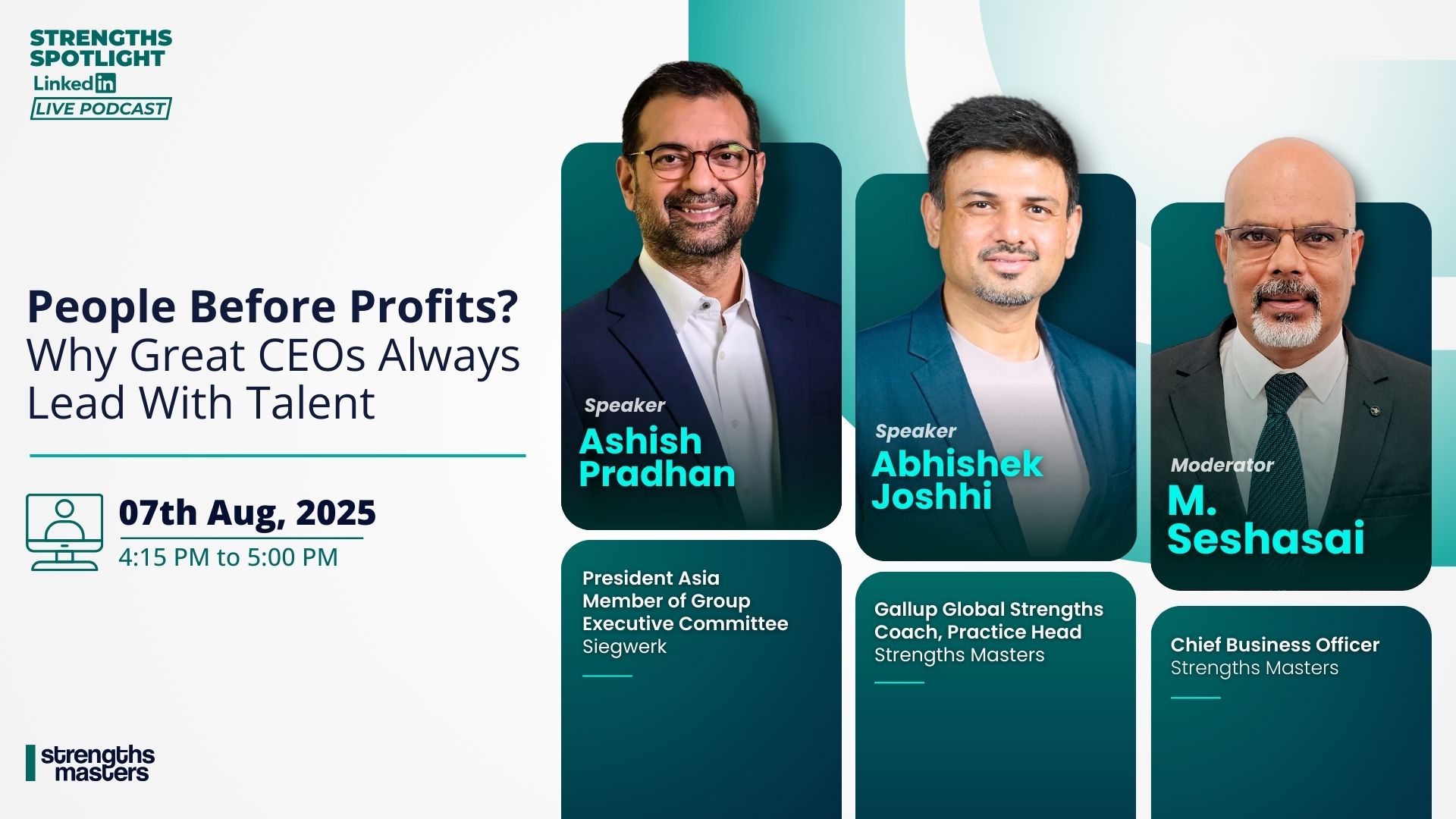 This philosophy took center stage in our latest Strengths Spotlight LinkedIn Live conversation featuring Ashish Pradhan, President Asia and Member of the Group Executive Committee at Siegwerk, and Abhishek Joshi, Gallup Global Strengths Coach and Practice Head at Strengths Masters. Together, they unpacked why prioritizing talent is no longer just an HR agenda; it’s a CEO’s responsibility.